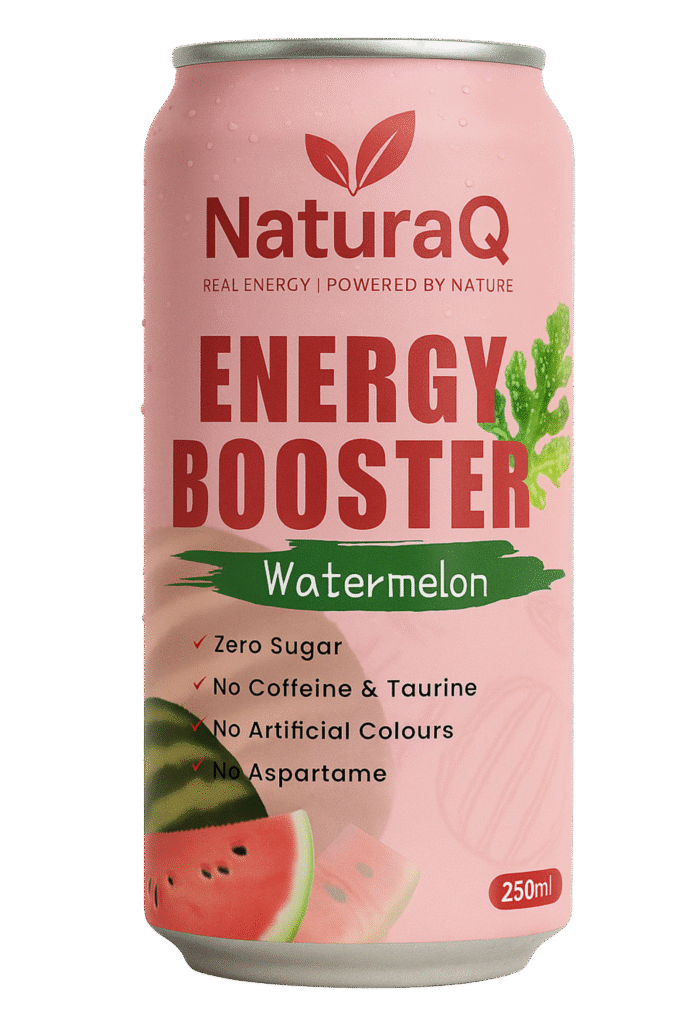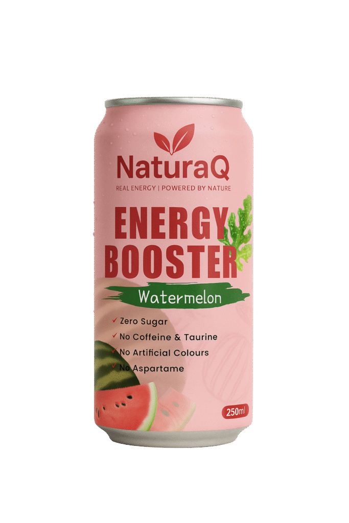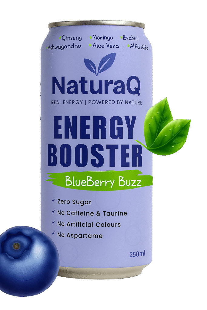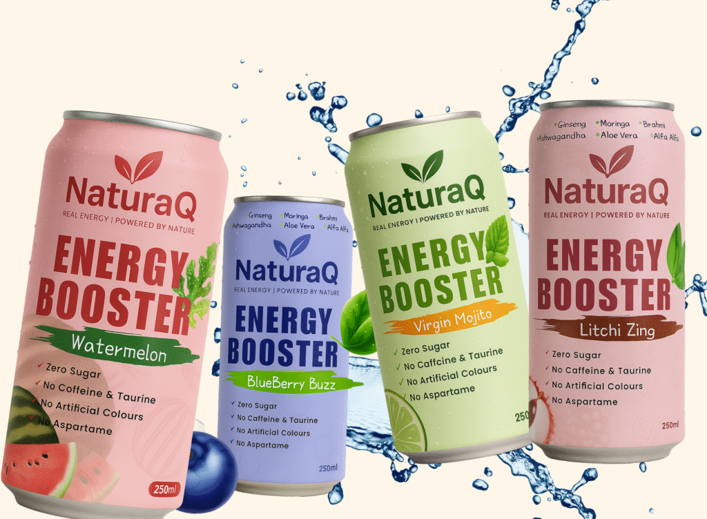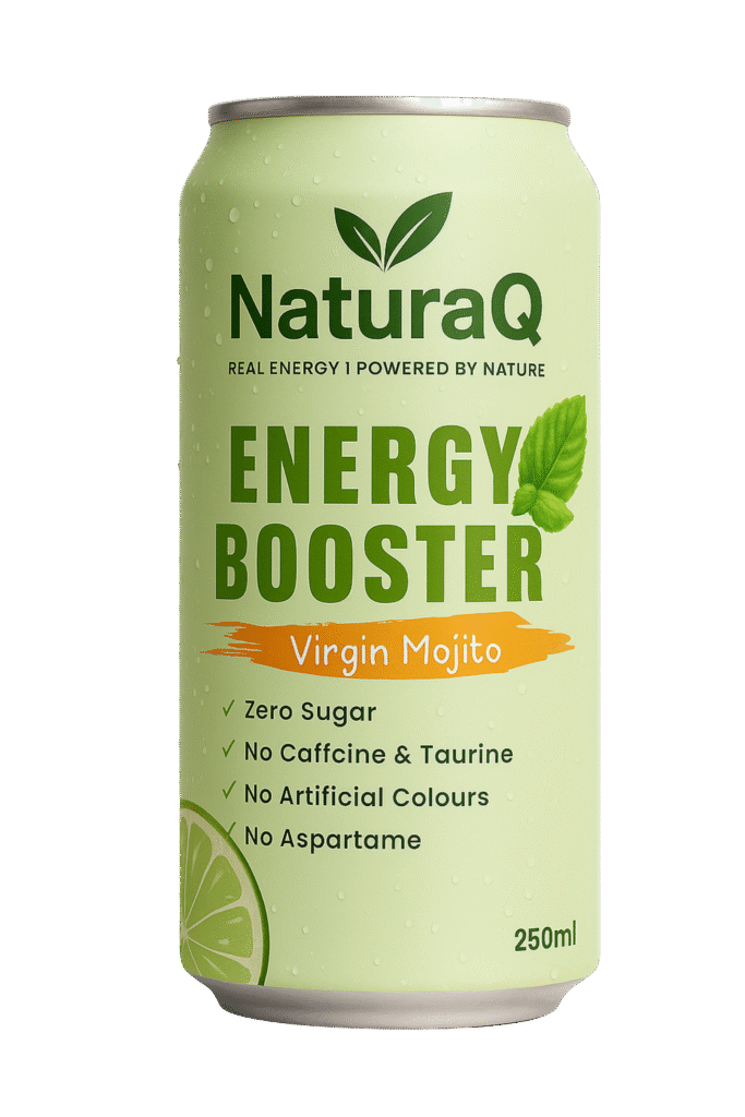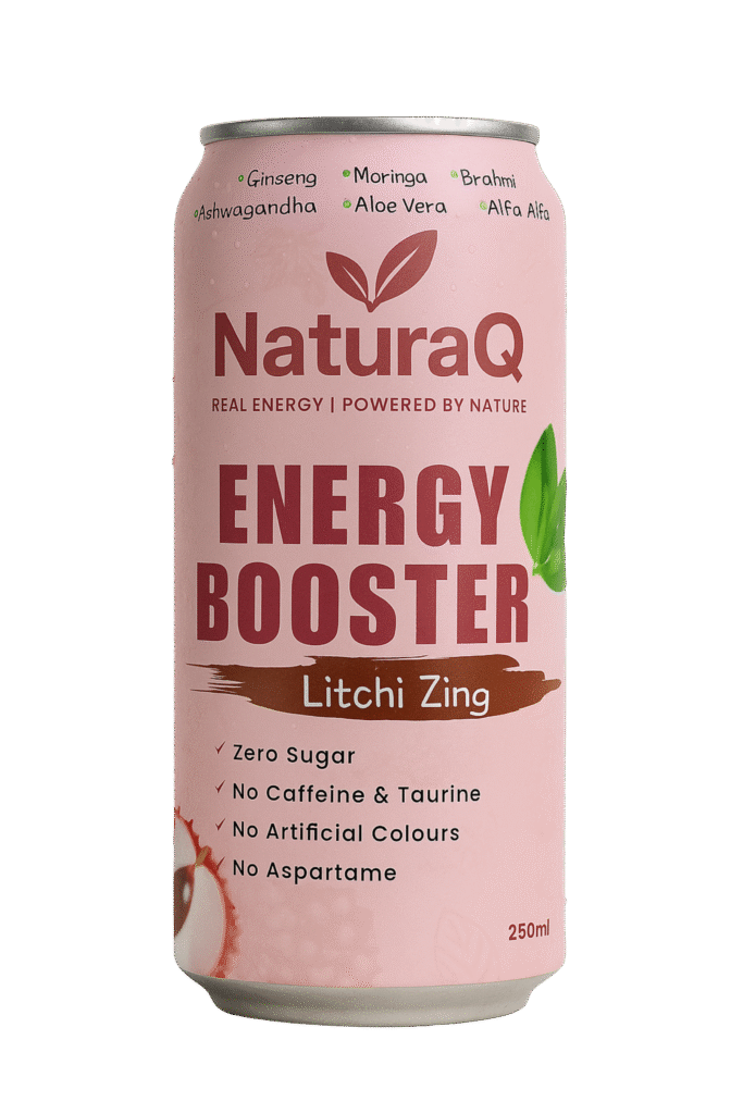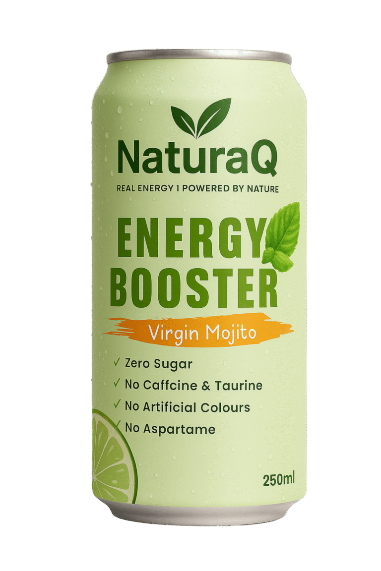 Discover the all-new NaturaQ Energy Booster – a clean, refreshing energy drink with zero sugar, no caffeine, and no artificial colors. Infused with natural goodness like Ginseng, Moringa, Ashwagandha, and Aloe Vera, it’s the smarter way to stay energized.